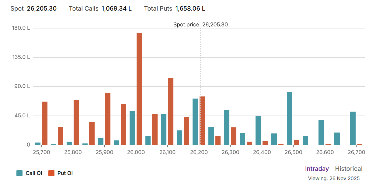 Support: An enormous support base has now been firmly established around the 26,000 and 26,100 strikes, where the most aggressive Put selling occurred. The Max Pain at 26,150 confirms this zone as the market’s new floor.