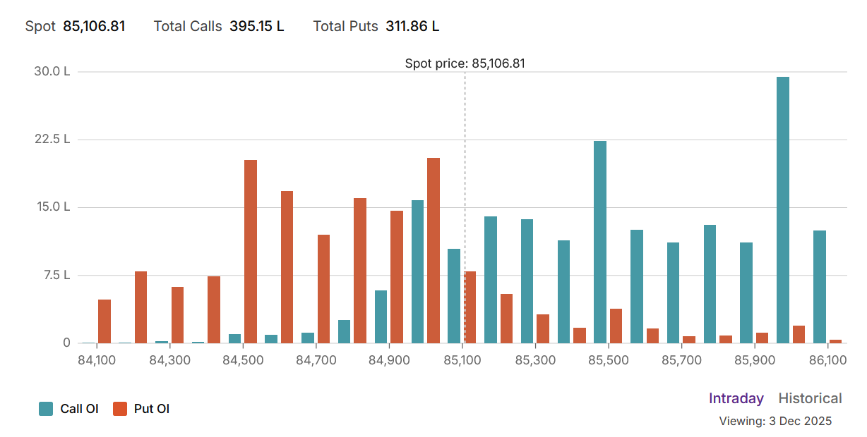 Support: A strong support floor has been established by put writers at the crucial 85,000 strike. This is the main line of defense for the bulls. Should this level fail, the next major support zone is located at 84,500.