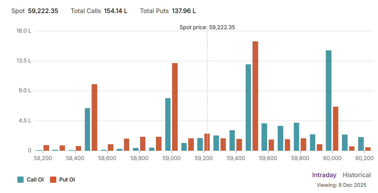 Support: The first significant line of defense for the bulls is the 59,000 strike, which has a strong concentration of put writers. The ultimate support floor for the current trading range is located at 58,500.