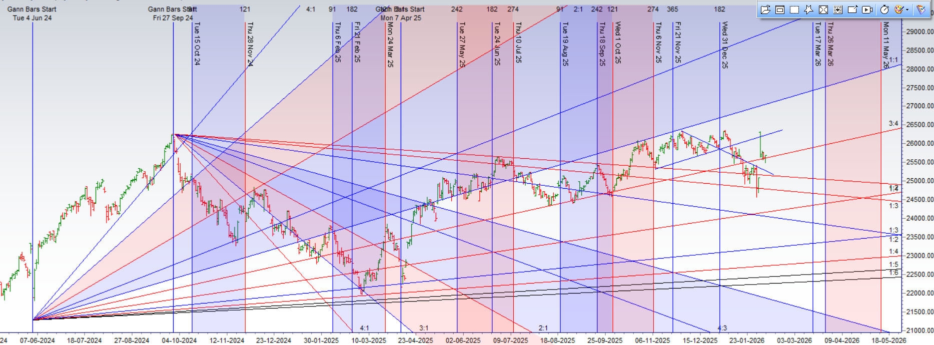Price took support at falling gann angle now holding 25450 rally back to 26000
