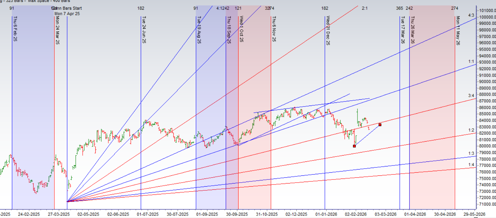 The theme for the Sensex is a classic structural breakdown culminating in a final, capitulatory washout. The index is technically broken (below 20/50 EMAs, RSI<50), and the sentiment is deeply bearish (PCR 0.45). The week will open with a continuation of the selling pressure, amplified by the uncertainty of the Sun-Uranus square. This initial move is designed to break the final line of support at 82369. The narrative flips on Tuesday. The monumental power of the Solar Eclipse, coinciding with a high-probability Gann Date, is a classic astrological setup for a major emotional low and an exhaustive bottom. This is the scheduled pivot. IF the Sensex forms a reversal pattern at a key support level on this day, THEN it signals the start of a new and powerful relief rally, confirmed by Wednesday’s Moon Darshan and subsequent supportive astrology.