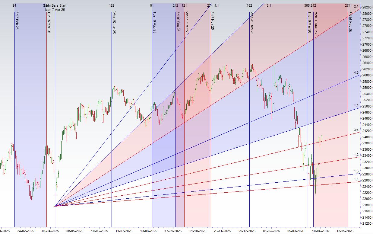 The Nifty has surged 1337 points, leaving it technically vulnerable to a mean-reversion move. The failure of the peace talks provides the fundamental excuse, but the astrology provides the timing. The early week will see the market struggle to digest the negative news and the Mars Zero energy. The critical test arrives mid-week. IF the Nifty forms a topping pattern (e.g., a bearish engulfing candle) on or around the Nifty Gann Date (Wednesday) and the Lunar Eclipse degree date (Tuesday), THEN it validates an exhaustion top and initiates a sharp corrective swing. The deceptive energy of Rahu SR on Tuesday warns that price action will be erratic and designed to trap late buyers.